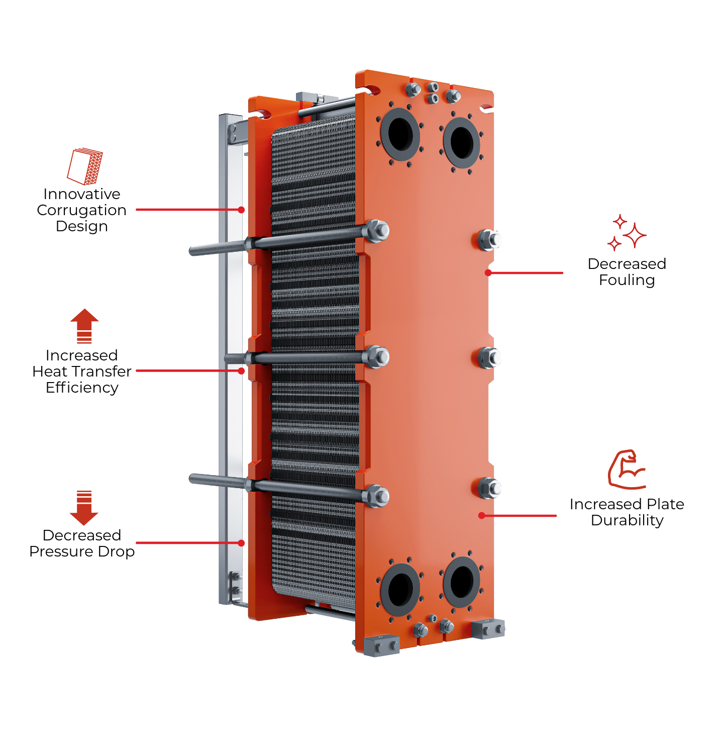 Learn MoreTriangle Tube’s Plate & Frame Heat Exchangers are engineered for high-efficiency thermal transfer across a wide range of industrial and commercial applications. Designed with an advanced currugated plate pattern which maximizes flow turbulence and heat transfer while minimizing pressure drop. With connection sizes available up to 14 inches, they accommodate high-capacity systems, making them ideal for demanding HVAC, process heating, cooling, and industrial fluid applications. Compact yet powerful, their modular design allows for full customization by selecting plate configurations, materials, and connection types to meet your specific operational requirements. Triangle Tube’s Plate & Frame Heat Exchangers provide a flexible and energy-efficient solution for industries that demand superior performance and durability.